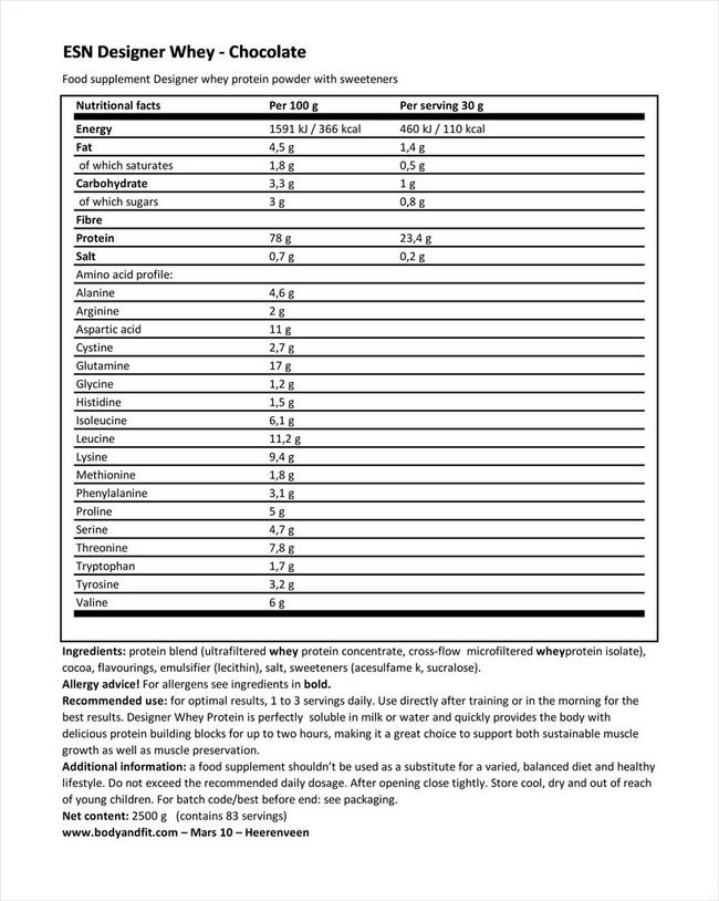 Designer whey von esn enthält einen sehr hohen proteingehalt mit nur wenig kohlenhydraten lactosearm und wenig fett.